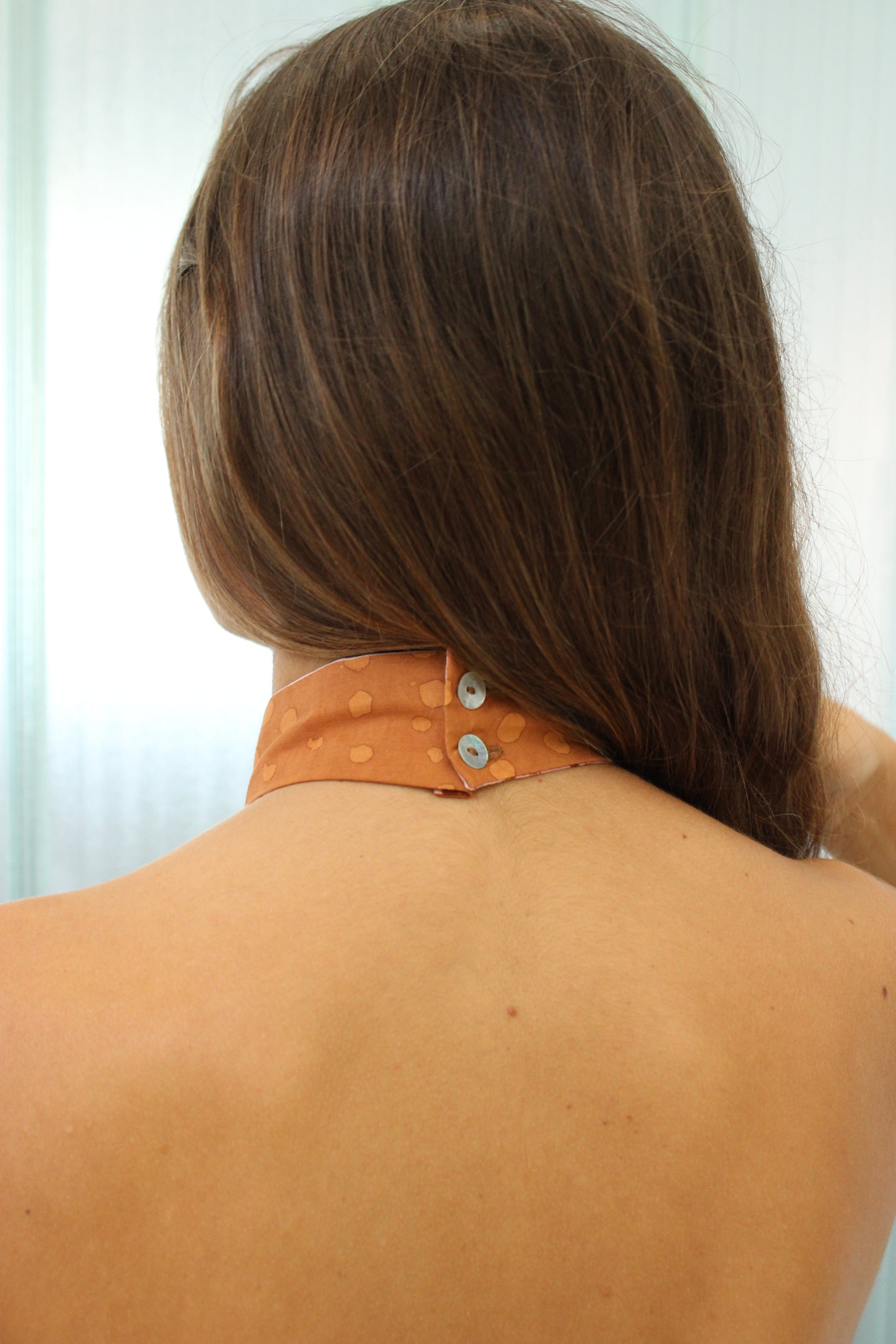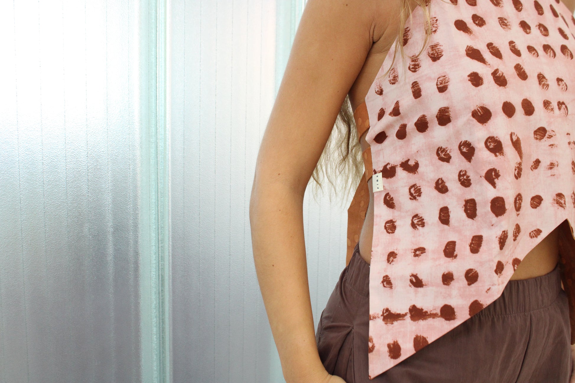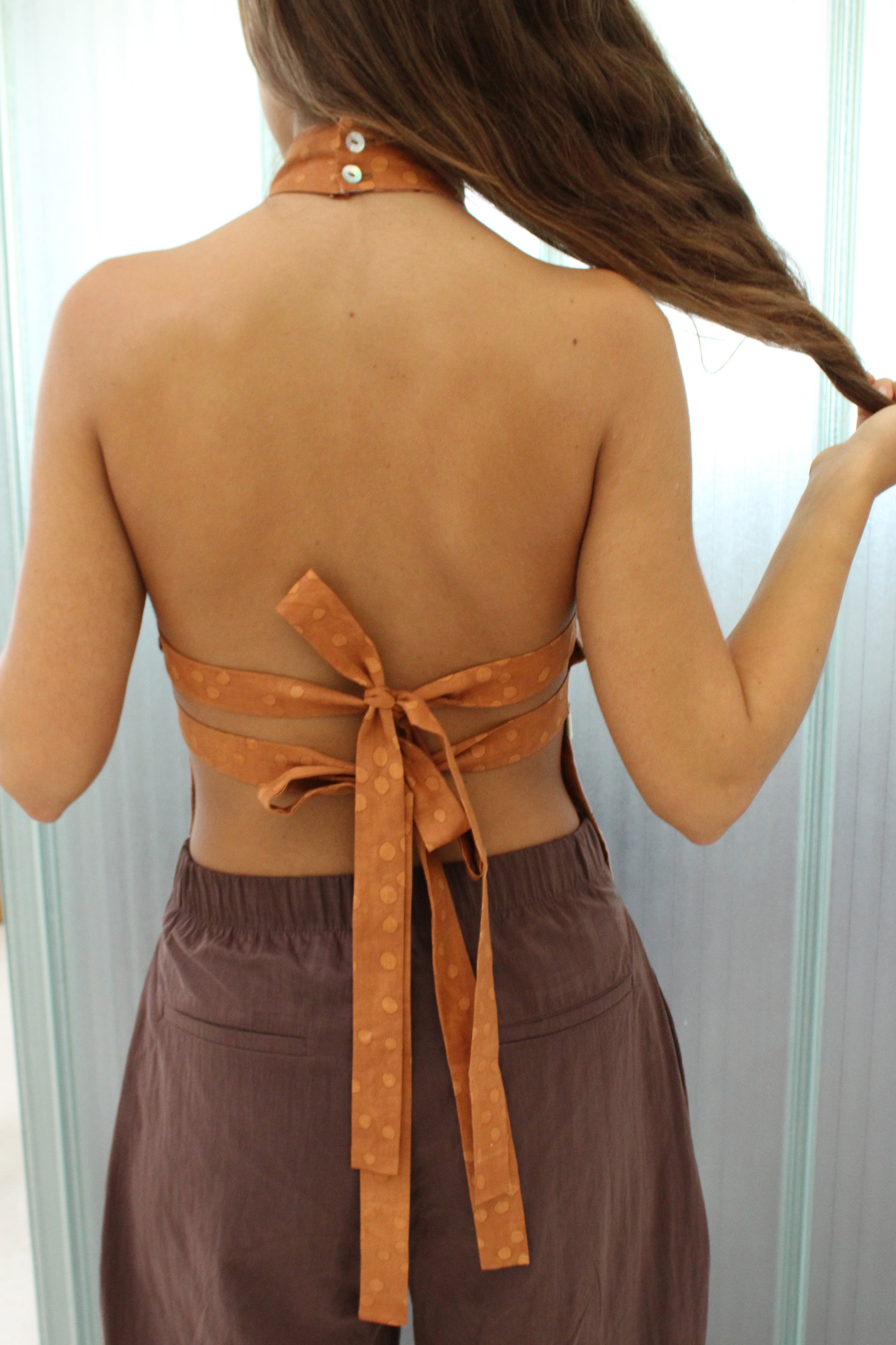 Las medidas son de ancho de 48 cm de lado a lado. Del cuello a la parte corta del delantero son 35 cm, y 50 cm a los picos. Las tiras miden 73cm de largo.
