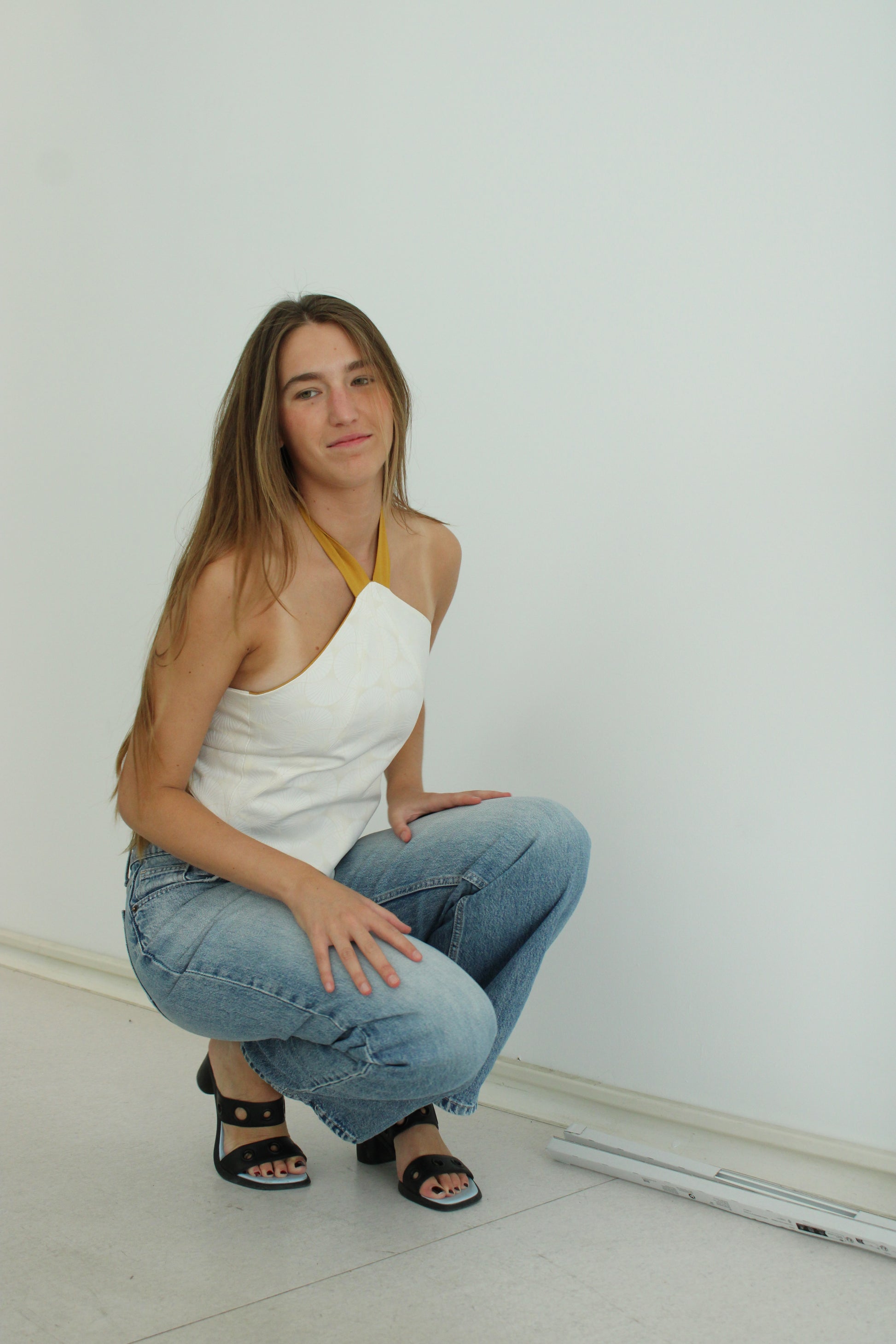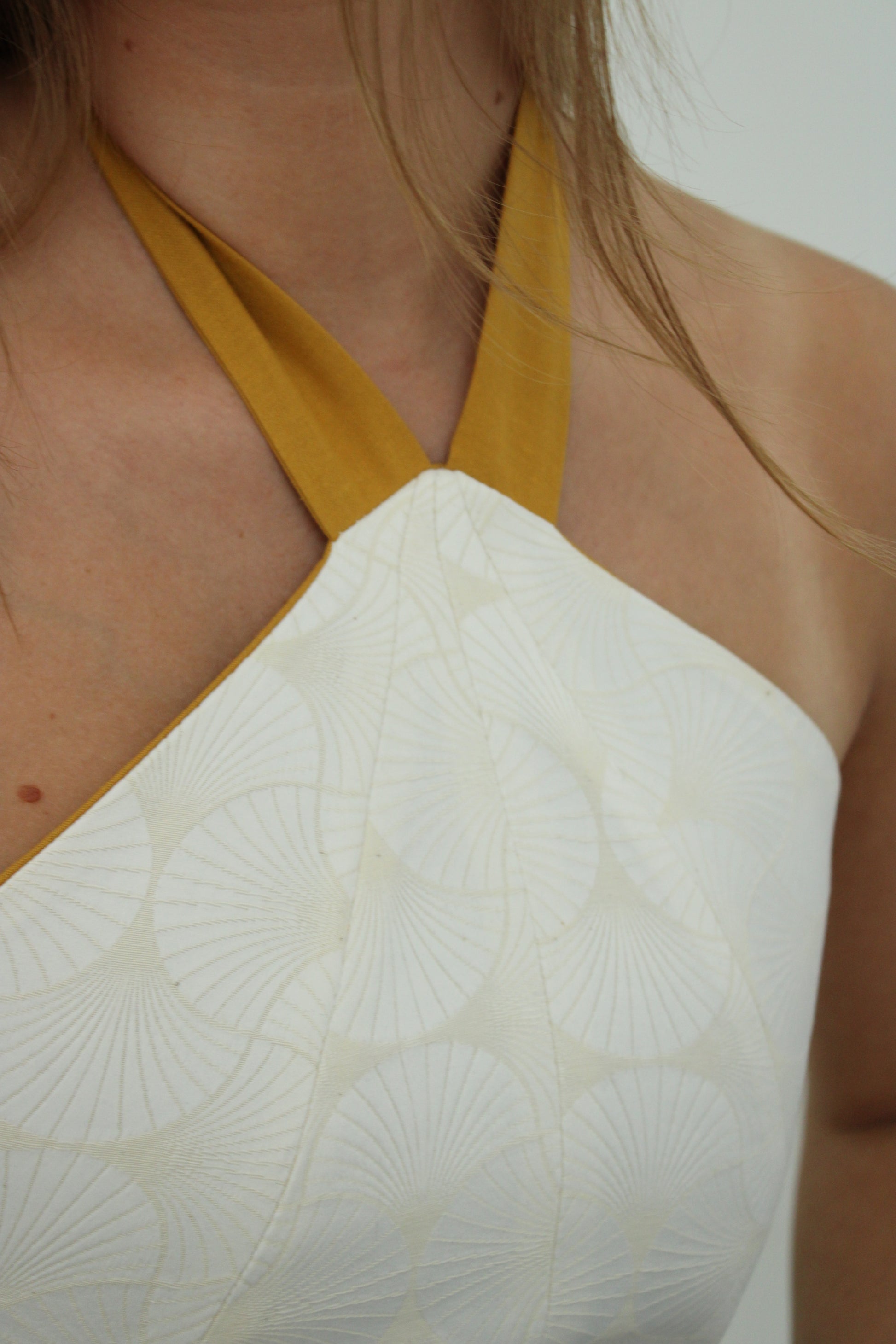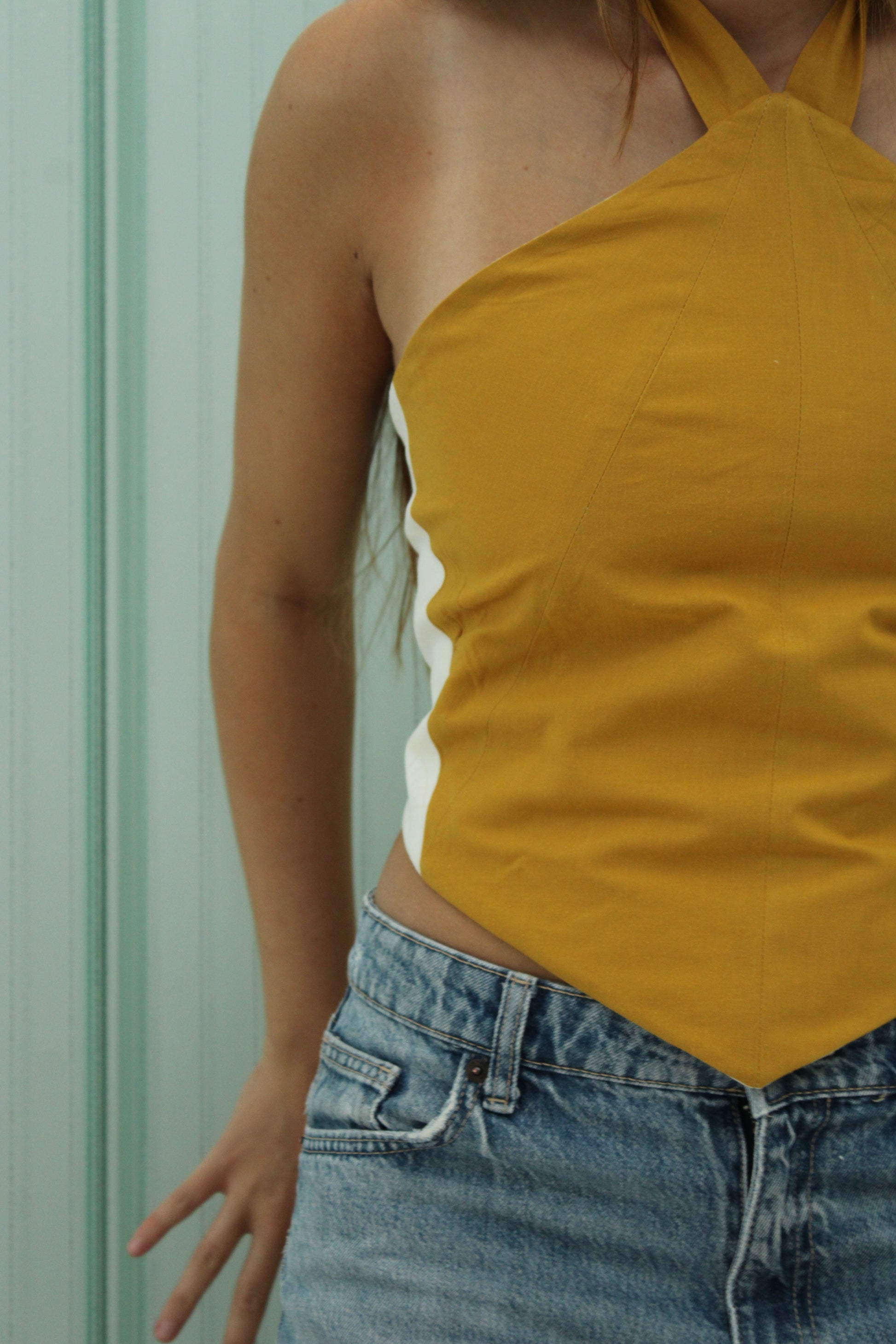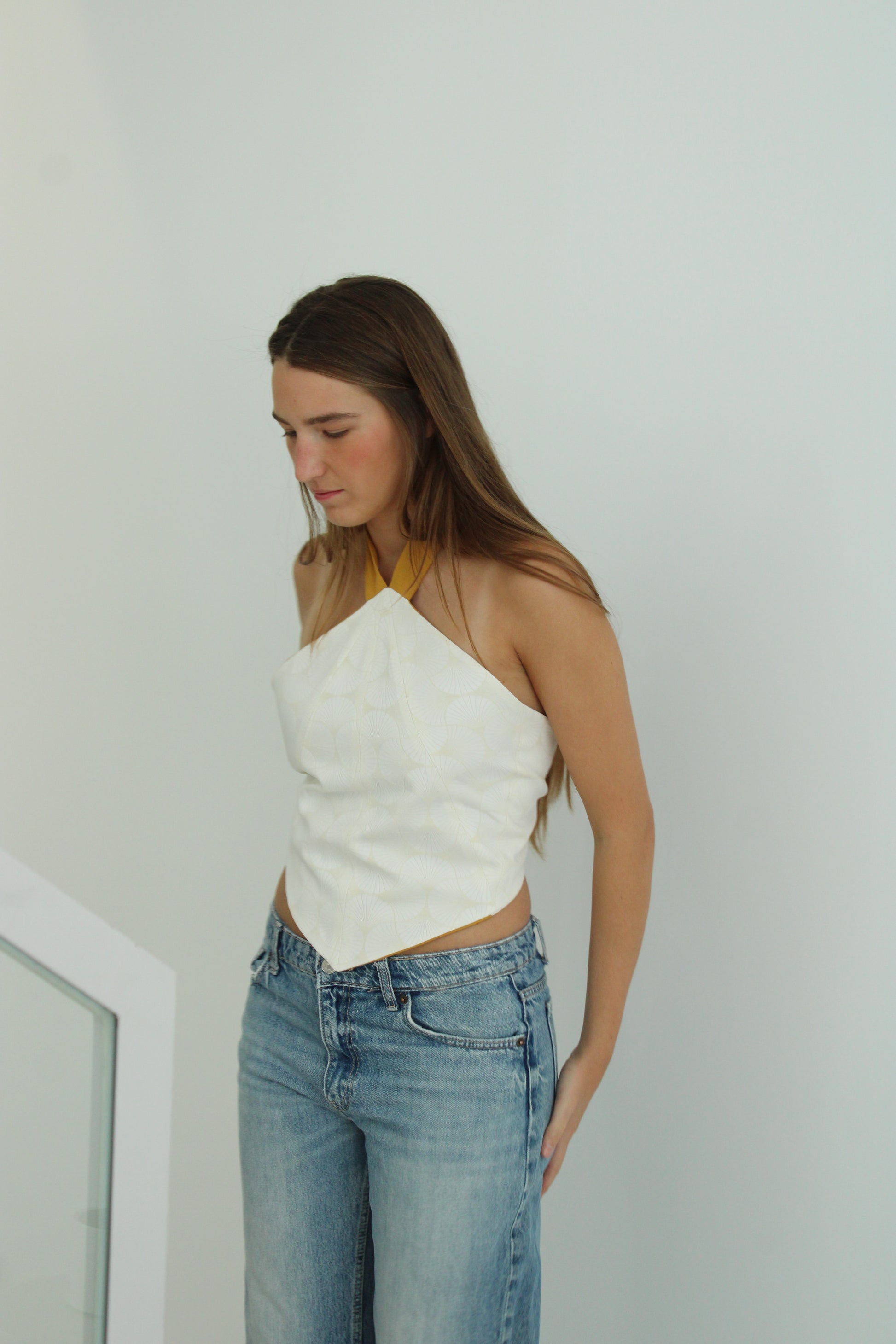 Las medidas son de ancho de 48 cm de lado a lado. Del cuello a la parte corta del delantero son 35 cm, y 50 cm a los picos. Las tiras miden 73cm de largo.