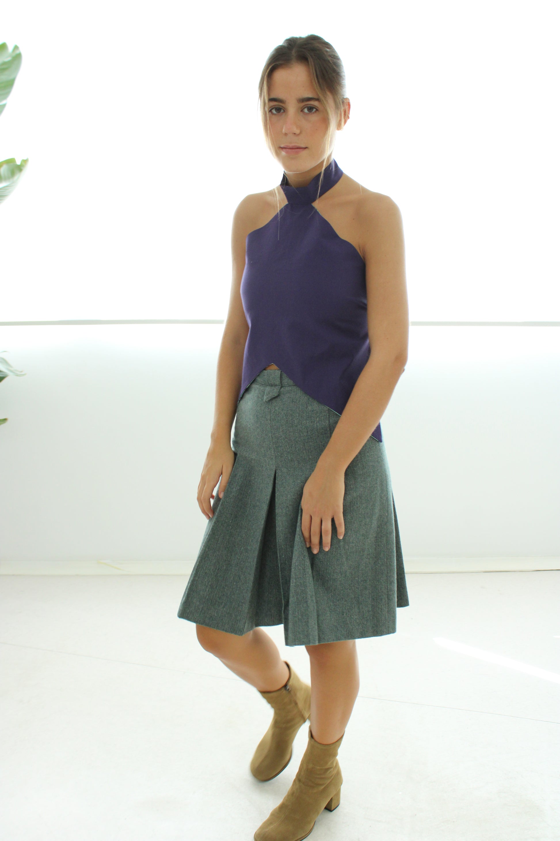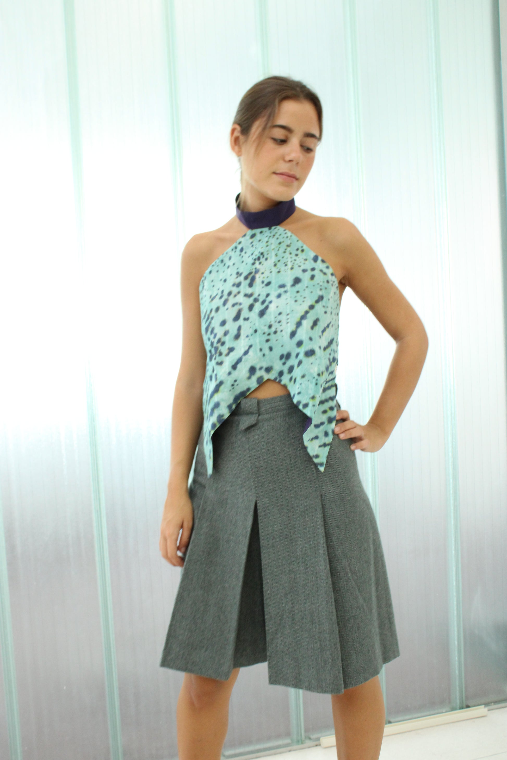 Las medidas son de ancho de 48 cm de lado a lado. Del cuello a la parte corta del delantero son 35 cm, y 50 cm a los picos. Las tiras miden 73cm de largo.